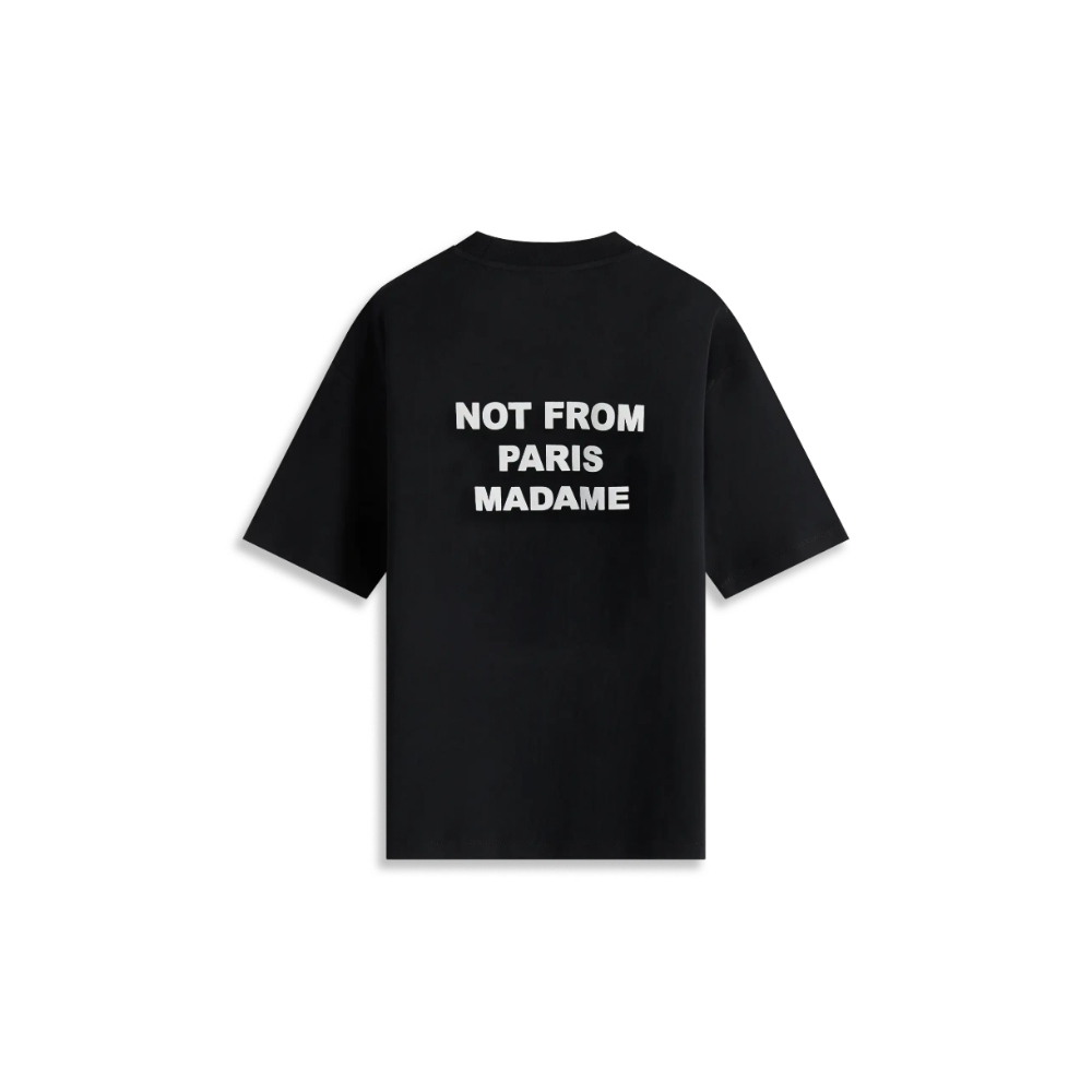 T-shirt con slogan. Realizzata in tessuto interlock di cotone 100%, questa t-shirt nera presenta uno scollo a costine e lo slogan "Not from Paris Madame" stampato davanti e dietro.