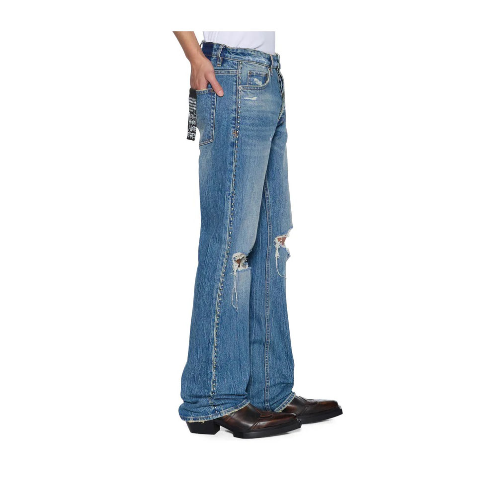 Bronko Texas Blue Studded è un jeans bootcut a vita media, realizzato in denim elasticizzato di alta qualità con lavaggio stone wash e borchie metalliche. Presenta dettagli decostruiti con strappi e riparazioni, dettagli hotfix con borchie metalliche lungo le cuciture laterali e orlo non rifinito. Rifinito con i caratteristici ricami T-box e 4x4 e dettagli metallici con marchio Ksubi.